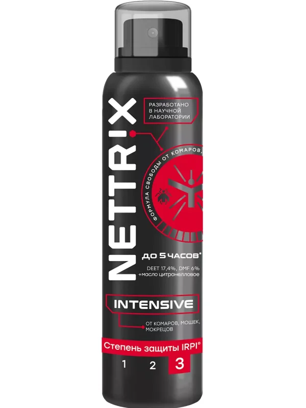 Аэрозоль Nettrix Intensive от комаров, мошек, мокрецов 150 мл — это эффективное репеллентное средство для защиты взрослых людей от нападения кровососущих насекомых (комаров, мошек, слепней, мокрецов, москитов, блох) при нанесении на открытые части тела и одежду.
