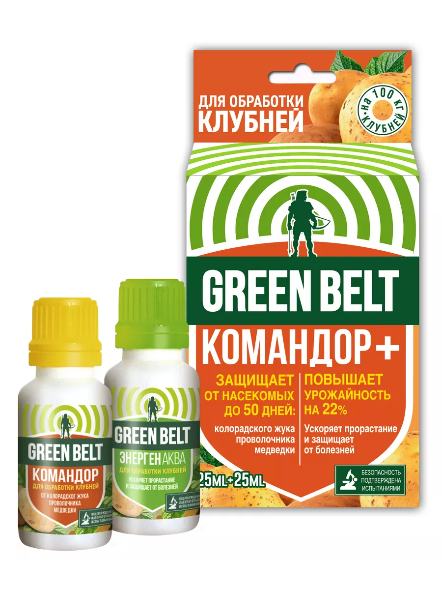 Командор защищает от вредителей (проволочника, медведки и колорадского жука). Энерген ускоряет прорастание клубней и защищает от болезней. Увеличивает урожайность картофеля на 29%.